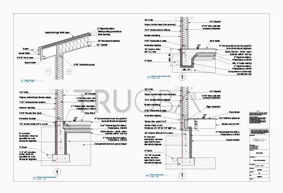 Detailed house cut-away thought floor, exterior wall and roof with outlined specifications. Door and window details too.