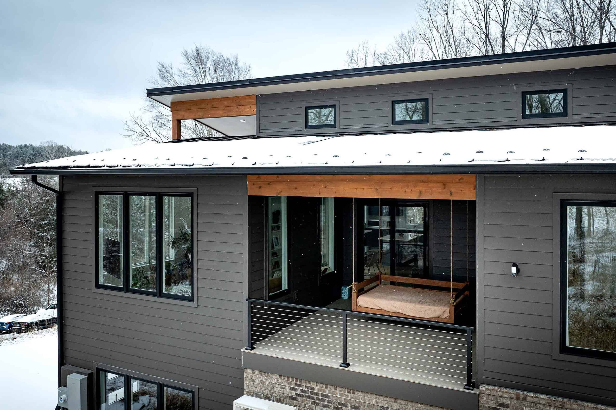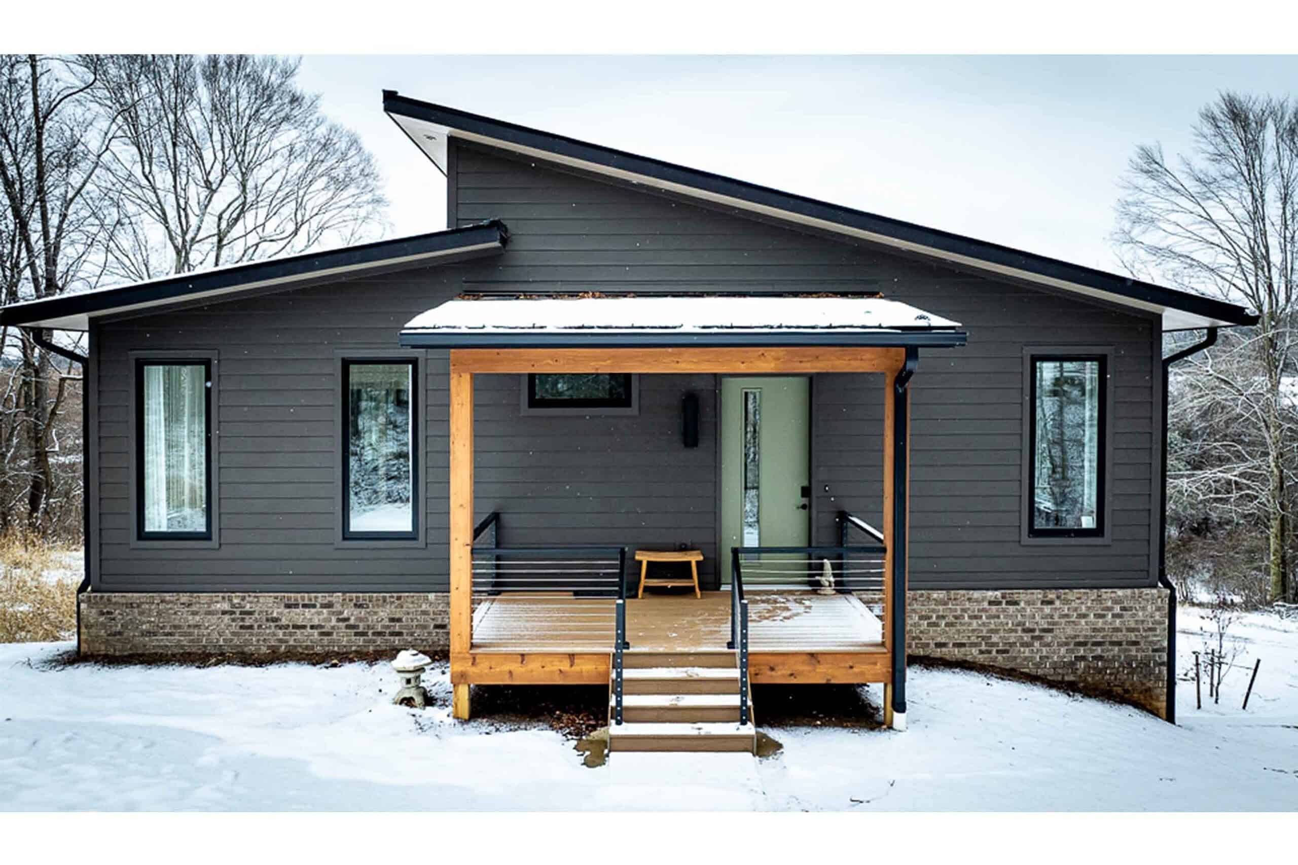 “I’m so happy with my home! I’m grateful to have found my Truoba house plan and the ability to customize it to perfectly fit my needs. My plan is only about 1,200 square feet but “lives” much larger – it’s cozy for a small group but easily accommodates a gathering of 15+ people without feeling too tight. My lot has gorgeous forest views in all directions that are enjoyed from the large windows in every room. Some of my favorite features of the house include the openness of the great room (it includes the kitchen, dining, and living room spaces all under a tall ceiling) and the oversized covered porch… I enjoy this outdoor space nearly year-round with my friends & family, even in the colder Michigan seasons with the help of the indoor/outdoor fireplace. Looking forward to many years of enjoyment & great memories in this awesome house!”
