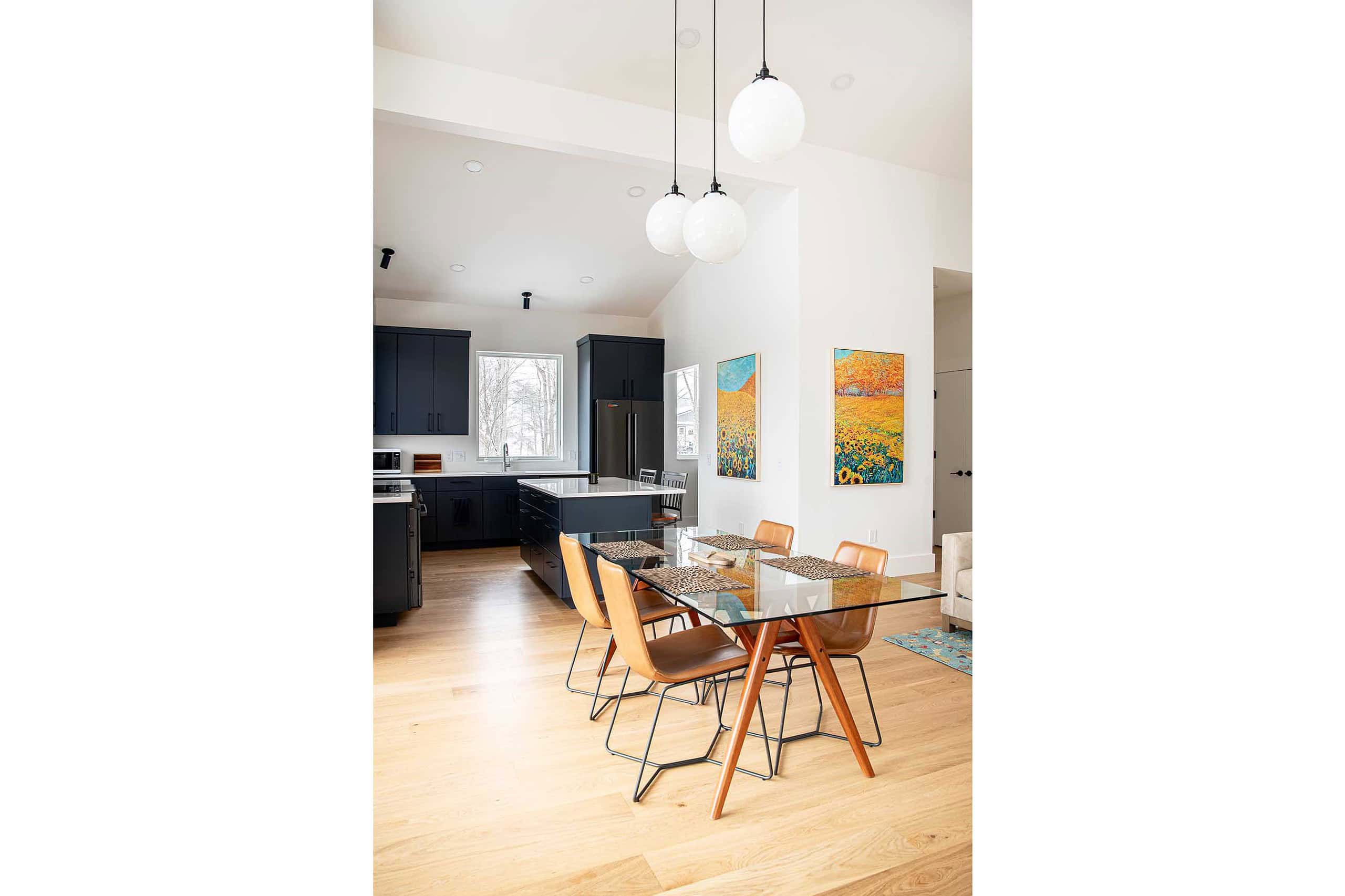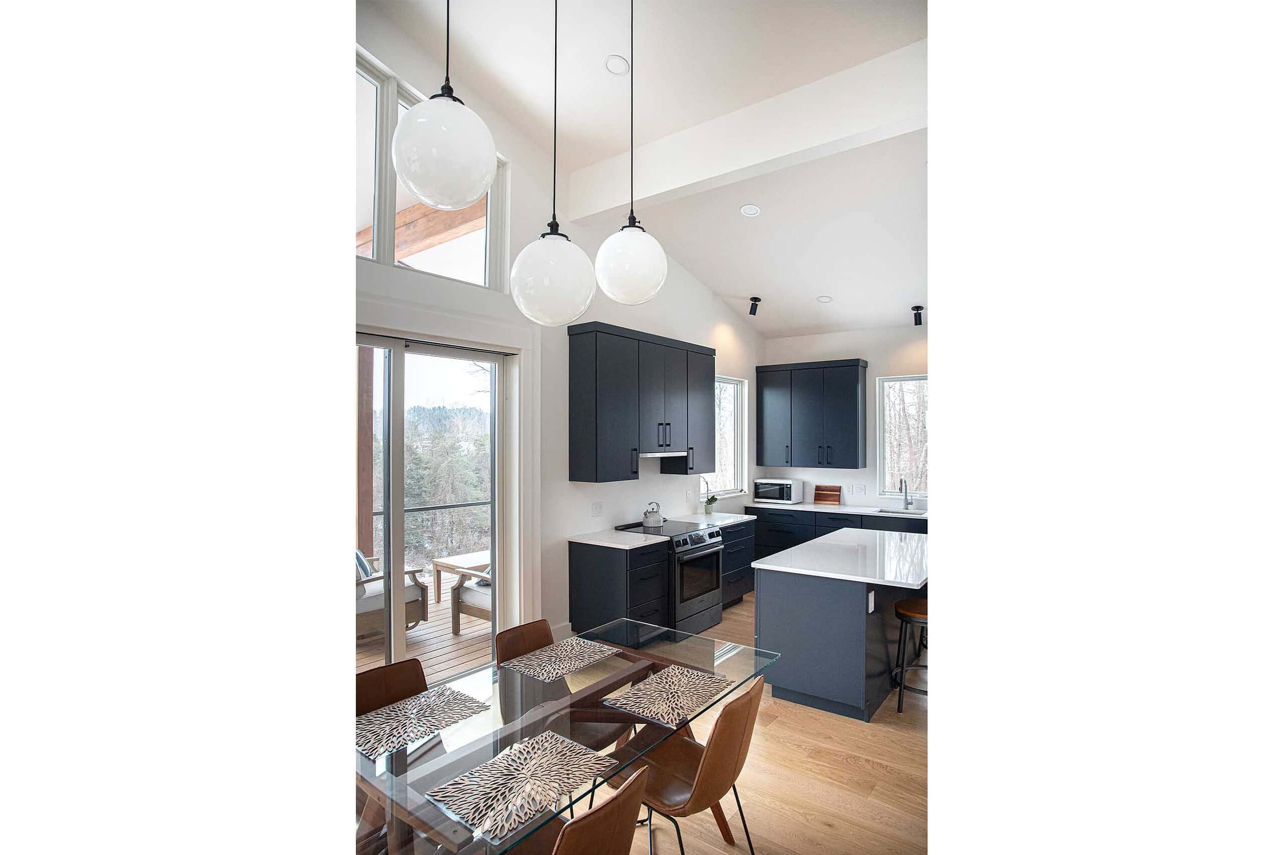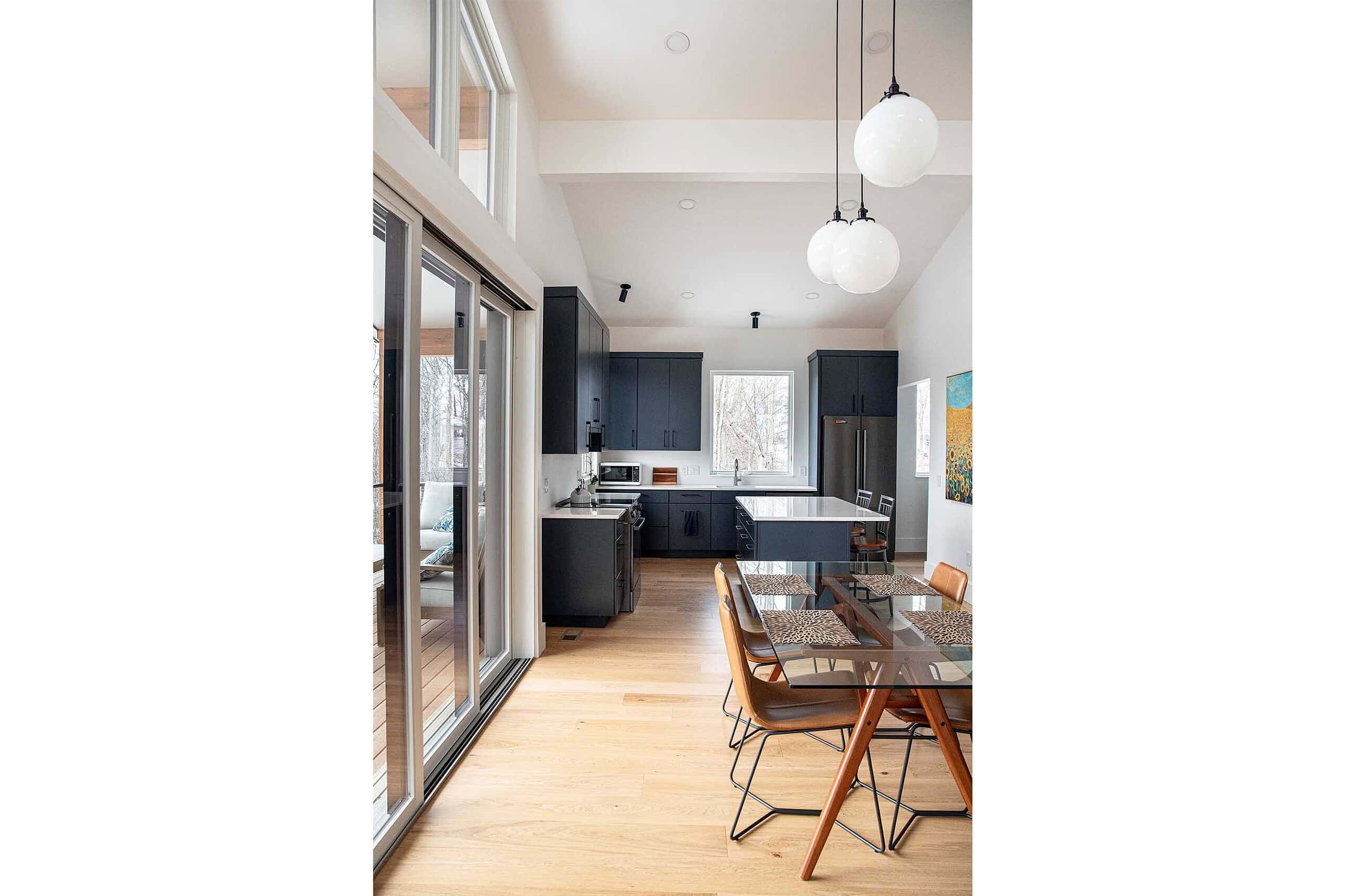 “After a career of global living, my goal was to create a modern house that integrated seamlessly with its surroundings and flowed unimpeded internally. Truoba helped bring this goal to life. Every room is light filled by the large window sets and sliders that erase the boundary with the outside giving unparalleled views of the mountains and stars. The modified longhouse floorplan is connected by a glass tunnel and winter garden area to create an effortless flow from end to end with the central house perfectly accommodating the no-hardware, Euro-contemporary/modern kitchen. Unobtrusive pocket doors allow for privacy when desired. The black scissor trusses and black window frames are a subtle complement to the black vertical siding giving the feeling of being enwrapped by the house. Everyone is kept comfortable through high efficiency windows and heat pumps/radiant floor heat as well as the use of foam insulation in all exterior walls/ceilings. It is simply a joy to live in and be part of this modern, flowing house.”