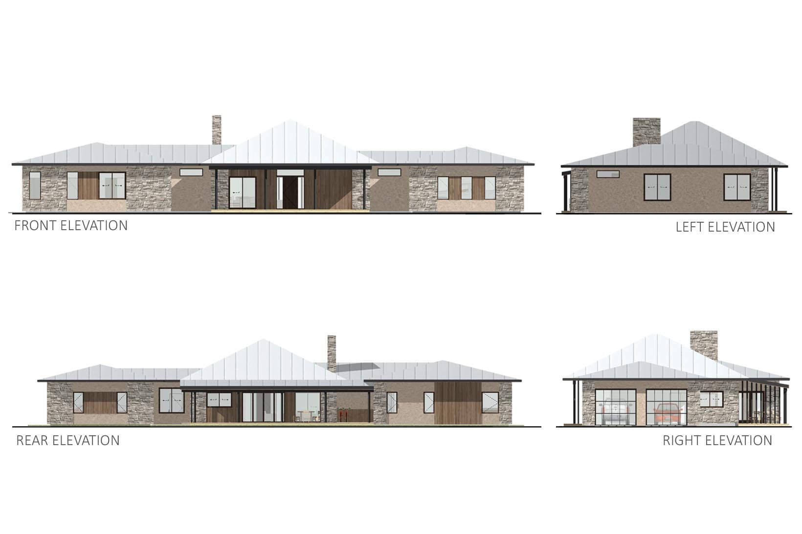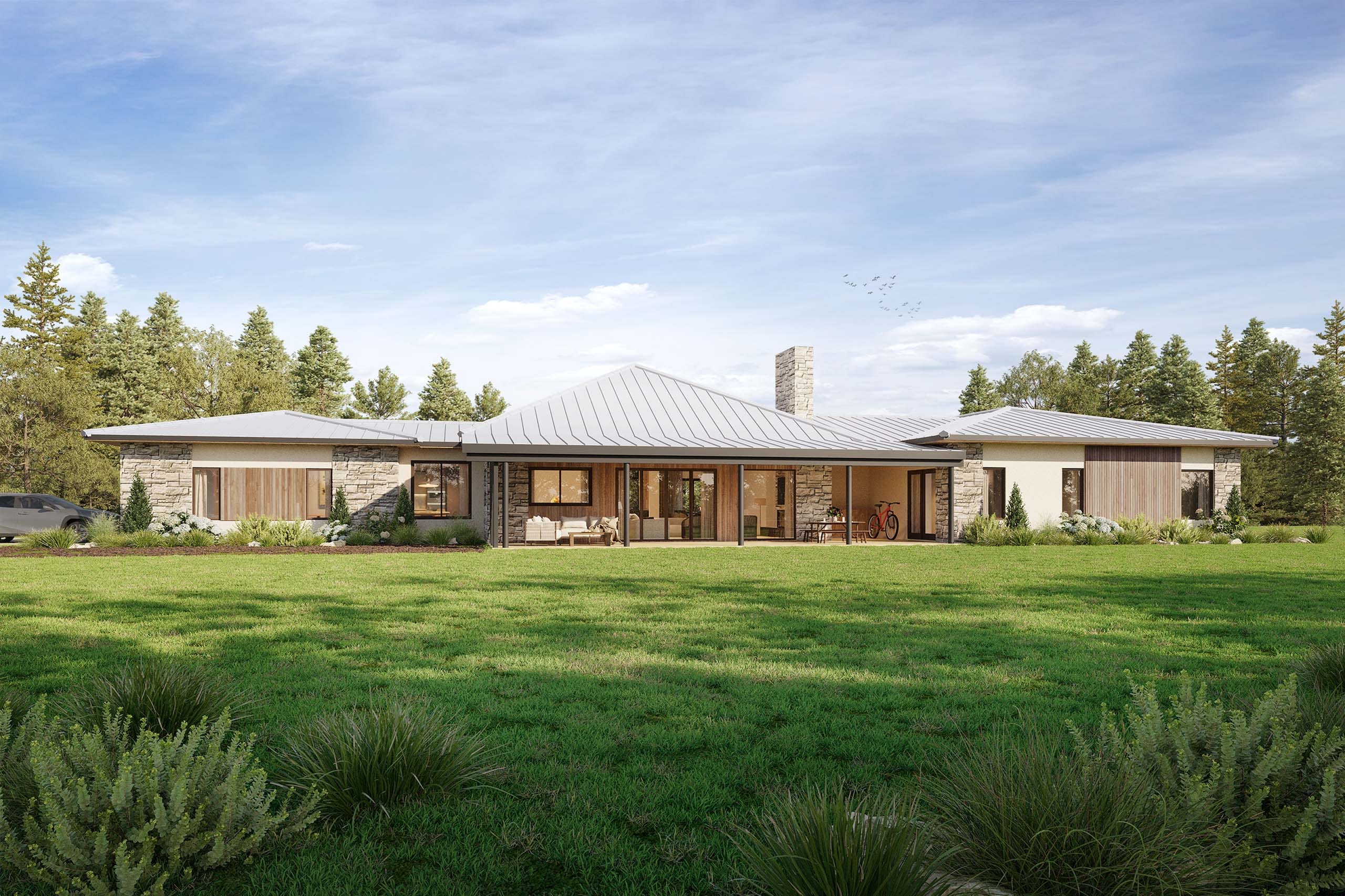 This hip roof home offers a midcentury modern look and classic comfort, with a strong focus on practical family living. The central open great room connects the different areas of the house while preserving the privacy of the bedroom wing and utility spaces. The exterior features a blend of stone, stucco, and wood siding, creating a warm and stylish facade.