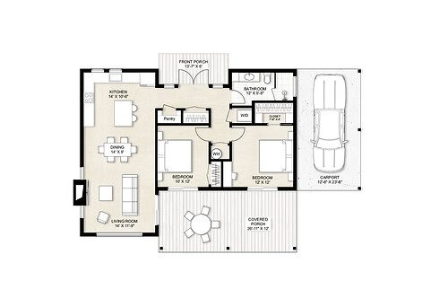 The kitchen and great room form a single, open-concept space, a layout commonly found in compact home designs. The living area opens onto a covered porch, which can be screened if desired. Two bedrooms are set apart from the main living area to ensure privacy and tranquility. The bathroom is conveniently located nearby. There are two separate closets: one accommodates a stackable washer and dryer, and the other provides storage space and houses the water heater.